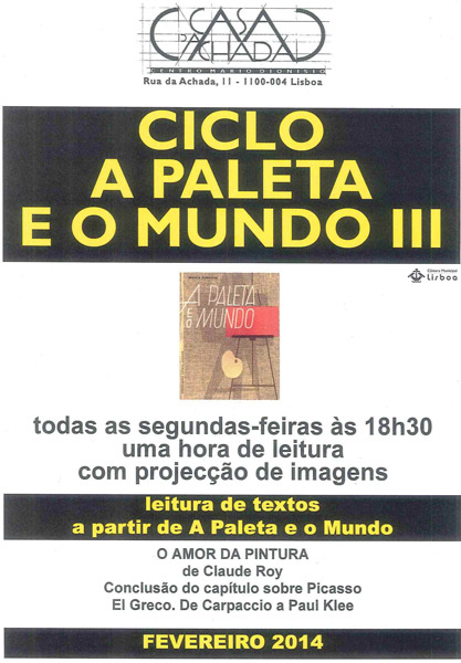 Em Fevereiro, Eduarda Dionísio conclui a leitura comentada, com projecção de imagens, de O amor da pintura de Claude Roy sobre Pablo Picasso. E continuamos com os capítulos sobre El Greco e de Carpaccio a Paul Klee.
