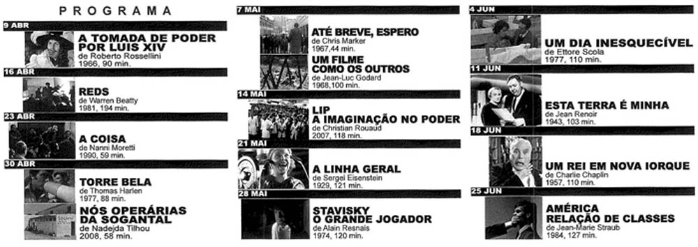 A política, e também a do dia-a-dia, com muitas histórias dentro, encontramo-la nas artes - e o cinema é uma delas. Temas e sobretudo modos diferentes de fazer as artes. Ao contrário do que muitas vezes se diz, ela não é distinta da arte. É parte dela. Abril é um mês em que dá vontade de recomeçar a falar. Vamos mostrar filmes da história do cinema, outros esquecidos, outros recentes, que poucos conhecem. E desta vez, apresentamos mais documentários do que é costume. Haverá sessões com dois filmes: sobre épocas com a política à vista, que marcaram quem vive hoje, mesmo que não estivesse nascido então - o 25 de Abril, o Maio de 68.