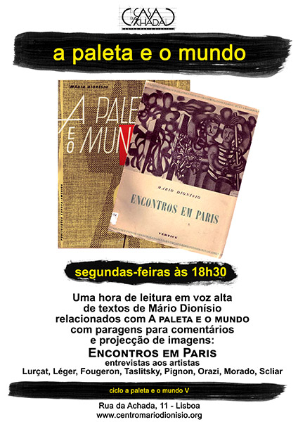 Uma hora semanal de leitura colectiva de textos de Mário Dionísio relacionados com A Paleta e o Mundo de Mário Dionísio, com paragens para comentários e projecção de imagens: Encontros em Paris (entrevistas feitas por Mário Dionísio aos artistas Lurçat, Léger, Fougeron, Taslitsky, Pignon, Orazi, Morado e Scliar).