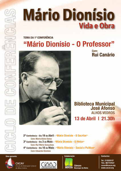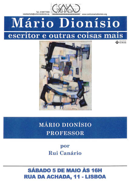 Nesta 4ª sessão sobre as várias facetas da obra de Mário Dionísio, acontece um encontro sobre o seu papel como professor, e quem nos vem falar disso é Rui Canário, também professor e investigador na área das ciências da educação. Rui Canário realizou uma palestra sobre Mário Dionísio e a Educação, «Criar e viver», na abertura da Casa da Achada, em 2009, que pode ser consultada aqui.