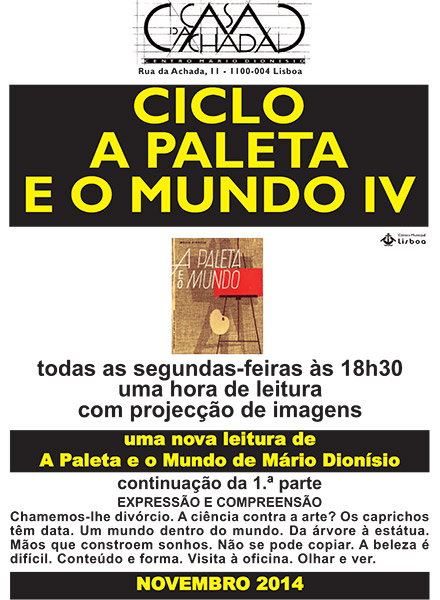 Na 4ª parte do ciclo «A Paleta e o Mundo» voltamos a ler a 1.ª parte de A Paleta e o Mundo, «Expressão e compreensão», de Mário Dionísio, a pedido de muitos dos que têm participado nestas sessões.