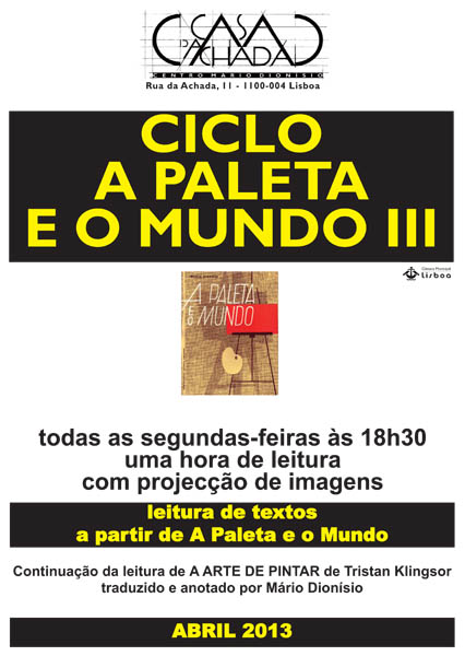 Em Abril continua a leitura comentada, com projecção de imagens, de A arte de pintar de Tristan Klingsor, traduzido e anotado por Mário Dionísio, por Eduarda Dionísio e Manuela Torres.