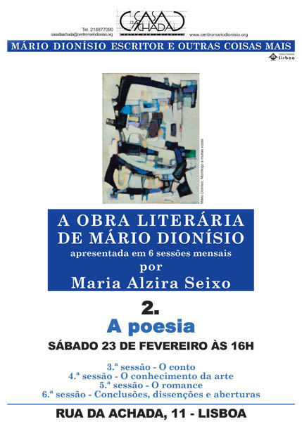 Em seis sessões mensais, Maria Alzira Seixo, professora catedrática da Faculdade de Letras de Lisboa, apresenta a obra literária de Mário Dionísio. Depois de em Janeiro termos falado sobre a Autobiografia, a crítica e o ensaio, nos meses seguintes abordaremos o conto, o conhecimento da arte, o romance; e por fim, em Junho, serão discutidas conclusões, dissenções e aberturas.