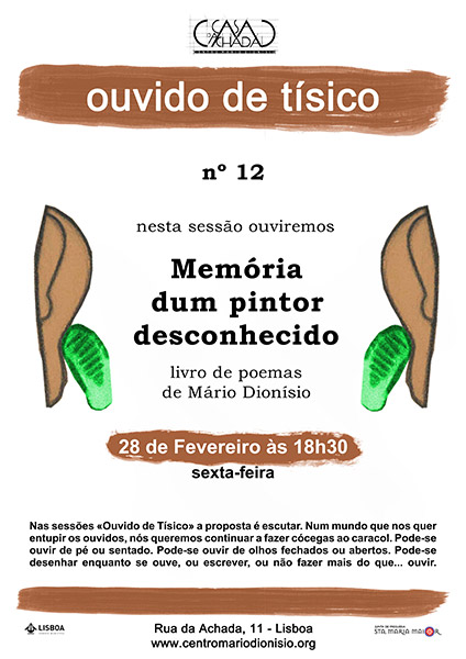 Nas sessões «Ouvido de Tísico» a proposta é escutar. Fácil? Difícil? Num mundo que nos quer entupir os ouvidos, nós queremos continuar a fazer cócegas ao caracol. Ouvir-se-ão textos de vários autores, saladas musicais, documentos desencantados do Centro de Documentação da Casa da Achada, discos do princípio ao fim, entrevistas, enfim, de tudo um pouco. Pode-se ouvir de pé ou sentado, sentado ou deitado. Pode ouvir-se de olhos fechados ou abertos, abertos ou semicerrados. Pode-se desenhar enquanto se ouve, ou escrever, ou não fazer mais do que... ouvir.