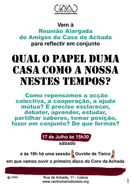 Uma tarde para reunir os «Amigos» da Casa da Achada, aproveitar para pôr as quotas em dia e pensar em conjunto sobre o papel que temos nestas circunstâncias complicadas. Vamos reflectir juntos sobre o que pode e deve ser uma intervenção cultural nos tempos que correm.