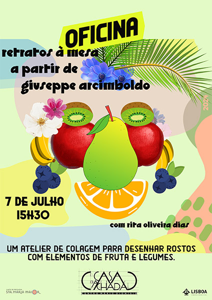 Um atelier de colagem para desenhar rostos com elementos de fruta e legumes.